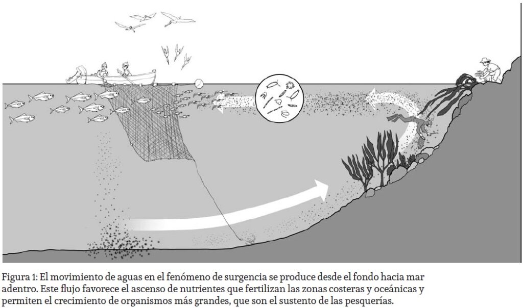 El motor que mueve las aguas son los vientos. Pero los vientos no mueven el agua en la misma dirección en la que soplan. Por influencia de la rotación de la Tierra, los vientos mueven el agua en ángulos rectos respecto a su dirección -un fenómeno conocido como transporte de Eckman-. Entonces, a lo largo de nuestra extensa costa, los vientos que soplan del sur empujan las aguas costeras superficiales mar adentro (hacia el oeste), alejándolas de la costa. Al hacer esto, queda un vacío en la superficie del mar que es llenado por aguas profundas que surgen y toman su lugar.